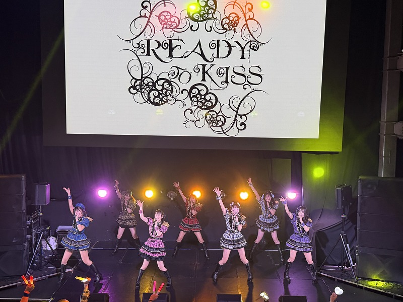 この日が、朝七みゆ、楠木ゆい、2人の新メンバーを加えた新体制お披露目ライブになったREADY TO KISS。結成からすでに12年以上の歳月が経過。今もREADY TO KISSは、メンバーの卒業と加入を繰り返しながら、常に変化を続けている。それを彼女たちは逆手にとらえ,つねに新鮮さを描き出す魅力にしてきた。READY TO KISSの強みが、そのときのメンバーの人数にあった姿に、その都度しっかりと染めあげてきたことだ。今の7人体制としては、この日が始まりになったわけだが、きっと早い時期に、今のREADY TO KISSという色に仕上げてくるはずだ。いや、この日のライブの時点で、未完成ながらも、誰が抜きんでいるわけでもなく、みんなで支えあい、補いあい、全員で観客たちを魅了するライブを彼女たちは描きだしていた。この日のライブには、『トップシークレット-切ない極秘事項-』『STAR LIGHT-星色のこの気持ち、空に映れ-』『エメラルド・クリームソーダ』『ムテキモード』と、READY TO KISSのライブを長年支えてきた定番曲たちを並べてきた。細かく見ていけば、粗も見えるライブではあった。ただ、さりげなくメンバー同士でカバーしあい、生まれたマイナス面をすぐにプラスへ塗り替えながら、終始笑顔を浮かべて歌う彼女たちを見ていると、マイナス面さえも楽しみながら、自分たちの力に変えようとしていく今の7人の気合と気持ちが見えてきた。成長過程の面を補って余るだけの楽曲のパワーがREADY TO KISSにはある。その安心感を背負っているからこそ、今のREADY TO KISSは未完成を完成形にしていくことを楽しんでいた。いつだって、ハラハラなスリリングさを与える、その刺激的なところもREADY TO KISSらしい。